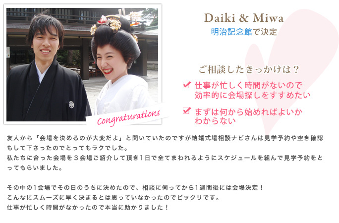 あれもこれもとこだわっていたら会場が見つからず、ネットでたまたま見つけたこちらに相談をしました。話をしていくうちに、自分がどうしてもゆずれない事、実はそこまでこだわらなくてもいい事などが見えてきました。もともとこだわりがはっきりしていたこともあるのか、見学は2会場だけですんなり決めるとことができました。